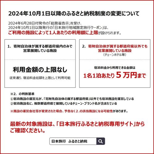 ■総務省告示第二百三号を受け、2024年10月1日以降の発行分より、当該宿泊施設の運営会社が該当自治体の属する都道府県外にも施設展開している場合、1人1泊5万円を超えるものはクーポン精算の対象外となります。