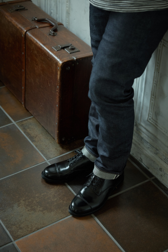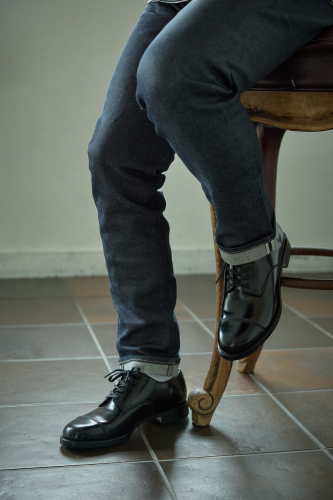 ビジネスシーンで活躍する艶のあるガラスレザーですが、履いてシワが入ると風合いを増してデニムなどのカジュアルなスタイルにもよく合う表情になります。