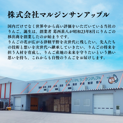 創業者葛西甚八が昭和23年にりんご移出商を創業した時から始まり、りんごの花が広がる津軽平野を次世代に残したい!先人たちの技術や思いを次世代へ継承していきたい!りんごの将来を担う人材を育成し、りんご産地の未来を守りたい!という熱い思いを持ち、自慢のりんごをお届けしています。当社のりんごは、「卸市場」「当社で営んでいる甚八りんご農園」「目利きのプロが認めるリンゴ農家さんへの生産依頼」、主にこの3つのルートから目利きのプロが選んだ美味しいりんごを取り集めることで、国内外から高い評価をいただいています。