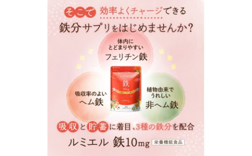 そこで、吸収と貯蓄に着目。3種の鉄分を配合した「ルミエル 鉄分10mg」で効率よくチャージできる鉄分サプリ習慣をはじめませんか?