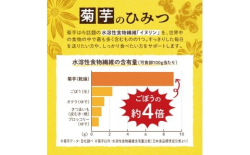・菊芋は今話題の水溶性食物繊維「イヌリン」を、世界中の食物の中でも最も多く含むものの1つ。水溶性食物繊維含有量は、ごぼうの約4倍!スッキリした毎日を送りたい方や、しっかり食べたい方をサポートします。
