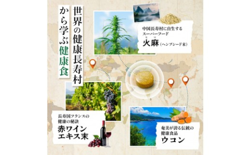 原材料:還元麦芽糖水飴(国内製造)、イチョウ葉エキス末、ウコン抽出物、ヘンプシード末、トランスレスベラトロール、レスベラトロール含有赤ワインエキス末、クルミ抽出物、大豆レシチン抽出物、ホヤ末、ピロロキノリンキノン二ナトリウム塩、バコパエキス末、還元型コエンザイムQ10、DHA含有精製魚油、マルトデキストリン、乳たんぱく質分解物(乳成分を含む)/セルロース、ステアリン酸カルシウム、二酸化ケイ素、葉酸、グリセリン脂肪酸エステル、酸化防止剤(V.E,V.C)、レシチン