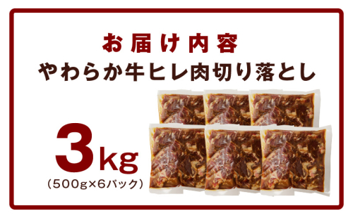 やわらか 牛ヒレ肉 切り落とし 3kg【小分け 500g×6P 氷温熟成×特製ダレ サイズ不揃い ステーキ ひと口サイズ カット済み】 mrz0153