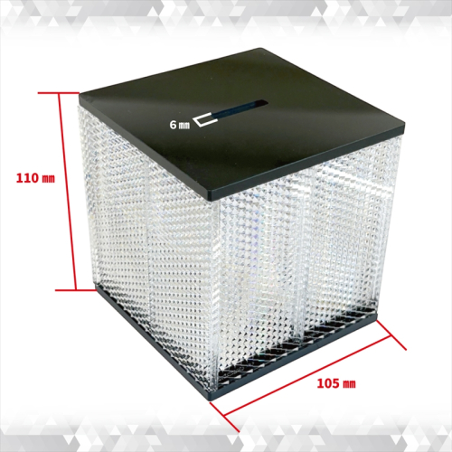 この「H.R.R.D」A DISPLAY MONEY BOXは、リフレクターレンズ特有のプリズムの効果でBOX内が幻想的に輝いて見え、コインなどを投入するとプリズム反射で不思議と多く見えます。