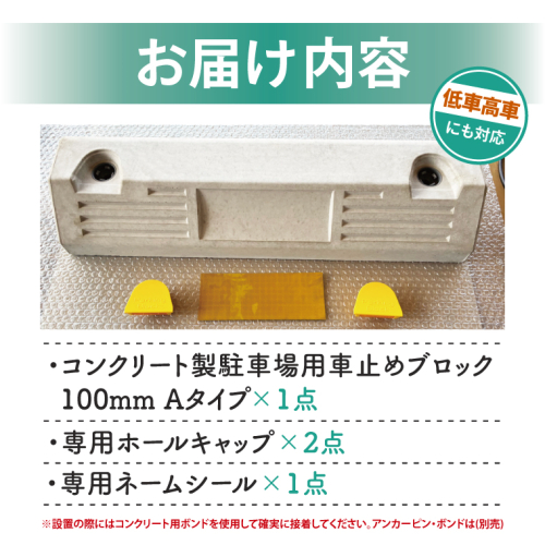 流し込み成形ならではの外観の滑らかさ、品質の高さにより美観に優れます。 夜間の駐車時には反射機能付きの専用ホールキャップにより視認性を向上いたします。 低車高車にも対応した高さの100Hタイプになります。 ※設置の際にはコンクリート用ボンドを使用して確実に接着してください。  アンカーピン、ボンド(別売) 【内容量】 ・コンクリート製駐車場用車止めブロック100mm Aタイプ×1点 ・専用ホールキャップ×2点 ・専用ネームシール×1点 【サイズ】 縦:160mm 横:600mm 高さ:100mm 【原材料名】 水、セメント、砂、砂利 【受付】 通年 【発送期日】 ご入金後、2週間程度で発送いたします 【提供事業者】 株式会社サイコン工業