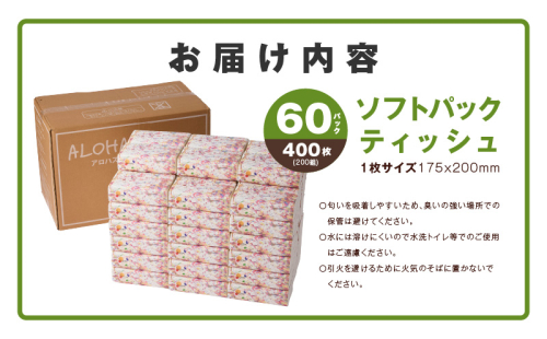 ALOHAS ソフトパックティッシュ 60パック×400枚(200組)【ピュアパルプ100% 生活用品 雑貨 日用品 必需品 常備品 まとめ買い 備蓄 防災 ティッシュペーパー】 010B1754