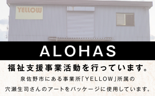 泉佐野市に拠点がある事業所「YELLOW」所属、穴瀬生司さんのアートを使用し、パッケージにデザインを施しています。また梱包出荷作業を障がい者の方が作業し、皆様の元へお届けします。