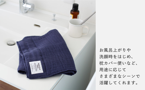 表面のガーゼによる優しい肌触りと、中層のパイルが持つ高い吸水性、パイルがサンドイッチされていることによるふかふかのボリューム感が気持ちいいタオルです。