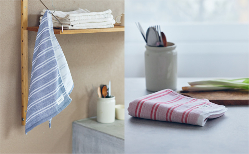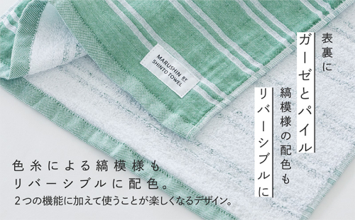 表裏にガーゼとパイル 縞模様の配色も リバーシブルに。 ガーゼとパイルを裏表に重ねて織り上げたガーゼパイルは、ガーゼの優しい肌触りとパイルが持つ吸水性を兼ね備えています。 さらに「シマ」は、色糸による縞模様もリバーシブルに配色し、2つの機能に加えて使うことが楽しくなるデザインに仕上げています。 通常のタオルよりも薄くて速乾性に優れ、ガーゼよりもしっかりと水分を吸収するので、家事周りや外出の際に活躍できるアイテムです。 綿100%
