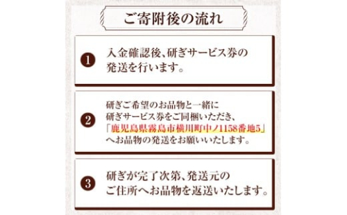 (2)研ぎご希望のお品物と一緒に研ぎサービス券をご同梱いただき、「鹿児島県霧島市横川町中ノ1158番地5」へお品物の発送をお願いいたします。