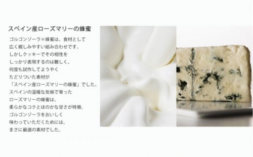 スペイン産ローズマリー蜂蜜を練り込んだ生地に、濃厚なゴルゴンゾーラのチョコプレートをサンドしたクッキーです。