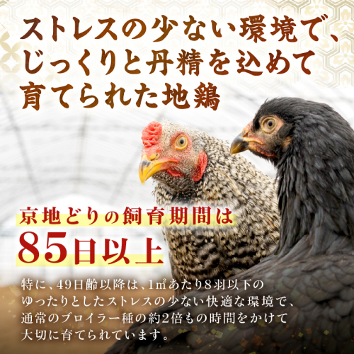 しかし当社の京地どりはブロイラーの4倍程度のスペースを確保し、走り回ることができる広々とした鶏舎でのびのびと育てているためお肉の食感は適度に弾力があり味が濃く、さっぱりでありながら力強い旨みの脂は地鶏らしい美味しさです!煮るのも、焼くのもオススメです。