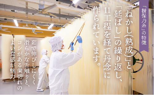 播磨の小京都・龍野で、およそ600年受け継がれてきた伝統の手延そうめん「揖保乃糸」。良質な小麦粉、揖保川の清流、赤穂の塩を原料とし、熟練した職人が1工程2昼夜をかけ、何回も熟成を重ねながら手作業で引き延ばしたこだわりの逸品です。
