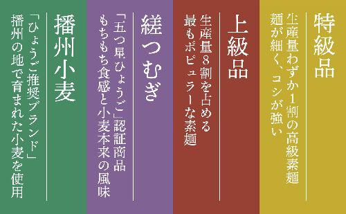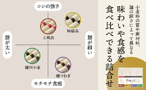 「揖保乃糸」を代表する4種類の手延素麺「揖保乃糸」をお届けします。小麦粉の質や原材料、麺の細さの違いによって異なる味わいや食感を食べ比べすることができる贅沢な詰め合わせ。香り高い小麦の風味とコシの強さが自慢の「揖保乃糸」を、いろんなスタイルでお楽しみくださいませ。
