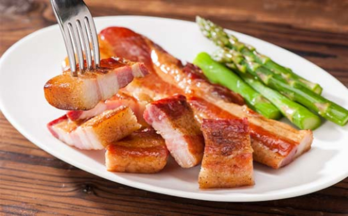北海道豊浦町産の豚バラ肉(チルド)に岩塩をすり込み、2週間の低温熟成でじっくりと旨味を引き出し、桜のチップで約5時間燻して仕上げたベーコンです。熟成された肉の旨味と芳醇な香りが特長です。
