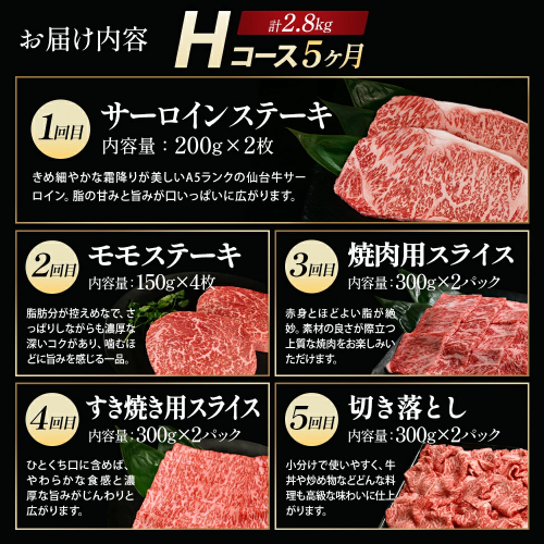 • 【毎月定期便】「A5仙台牛Hコース」 ステーキ・焼肉・すき焼き・切り落とし 全5回【04301-0863】