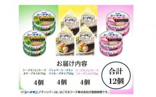 2種類のシーチキンLフレーク(オリーブオイル・コラーゲン入り)とディッパーシーチキンマヨネーズを詰合せしました。