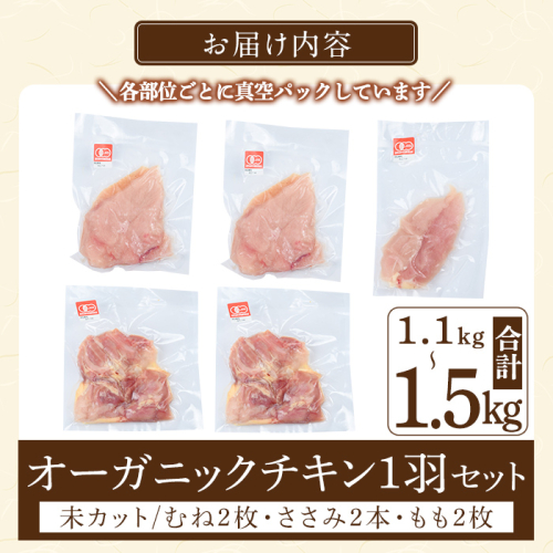 K-598 国産!オーガニックチキン1羽セット 未カット (計1.1kg~1.5kg)【お多福たまご】霧島市 国産 鶏肉 鳥 もも モモ 胸肉 むね ムネ ささみ ササミ オーガニック 有機JAS認定 抗生物質不使用 ワクチン不使用 ワクチンフリー 無投薬飼育 冷凍 小分け