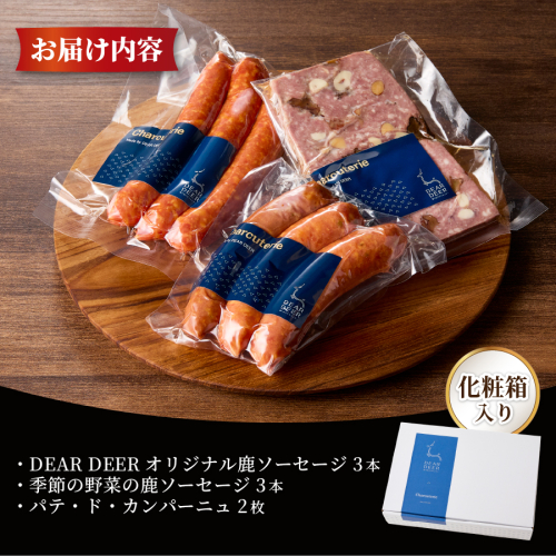 当店一番人気「DEAR DEERオリジナル鹿ソーセージ」と、それをベースに季節の野菜(青唐辛子、大葉、栗など)を練りこんだ風味豊かなソーセージ、そしてフランスの田舎を思わせる、心温まる味わいの「パテ・ド・カンパーニュ」はワインとの相性が抜群です。