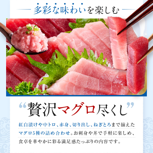 マグロ5種類(紅白漬け・メバチ中トロ・メバチ赤身・めばち切出し・ねぎとろ)の詰め合わせで、内容も充実。