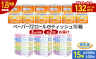 定期便 3ヵ月毎 全2回 ブライティア ソフト ボックス ティッシュ 200組 400枚 15箱 (5箱×3) BOX ジョイマインドトイレットペーパー ロングロール シングル 72ロール (12ロール×6個パック) 長さ110m 日本製 北海道 倶知安町 日用品