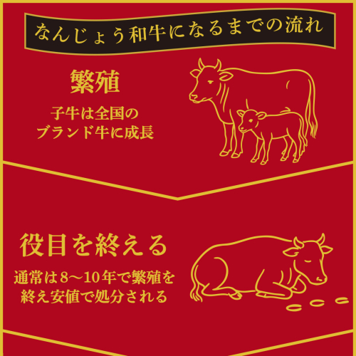 南城市の豊かな土地の恵みを受けた牧草を食べ肥育した黒毛和種の経産牛(子牛を産んだ経験のあるお母さん牛)格付け等級2級以上で、脂身が少なく独特な風味と旨みがあります。