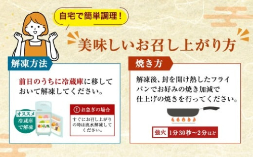 解凍後、封を開け熱したフライパンで強火で1分30秒~2分ほどお好みの焼き加減で仕上げの焼きを行ってください。