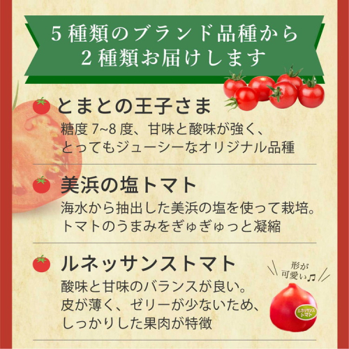 「小鈴ファーム」でしか買えない「とまとの王子さま」や、地元の塩を生産過程で使った「美浜の塩トマト」など、味わい豊かな5種類のブランドトマトのうち2種類+旬のカラフルなミニトマトをたっぷり約1kg詰め合わせました。