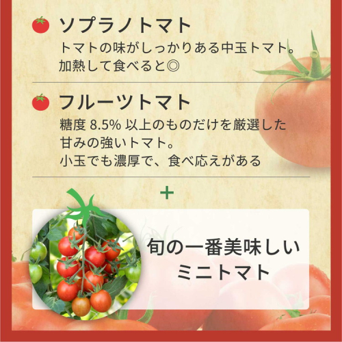 トマトの種類やそれぞれの内容量はお選びいただけません。楽しみにお待ちくださいね。