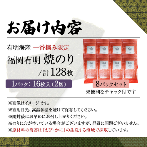【有明海産一番摘み限定】福岡有明のり(焼のり)2切128枚(2切16枚×8P)【チャック付・賞味期限1年】