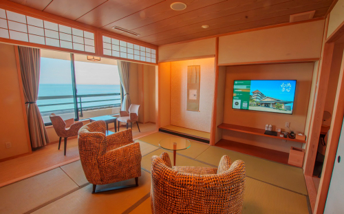 開放感あふれる広さに、最上階からの眺望を独り占め。客室にある檜風呂からも瀬戸内海を望むことができ、「日本の夕陽100選」にも選ばれた絶景が広がります。源泉掛け流しの大浴場「洗心の湯」とあわせて、心身をととのえるご滞在をお愉しみください。