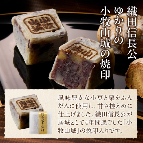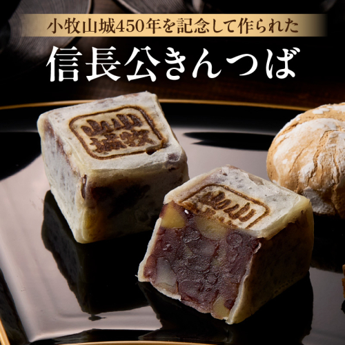信長公きんつば:織田信長公は小牧山城を居城として4年間過ごしました。信長公きんつばは小牧山城450年を記念して作られました。きんつばは、北海道の風味を味わっていただきたく、栗を加えておいしい味を追求しました。