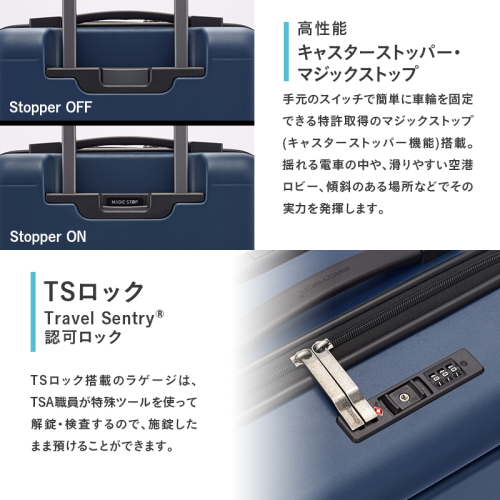 TSダイヤルファスナーロック(Travel Sentry(R)認可ロック)搭載で、施錠したまま預け入れ可能。