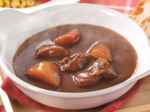 牛肉(オーストラリア産)、野菜(じゃがいも、にんじん)、炒め野菜ペースト(玉ねぎ、にんじん、セロリ、その他)、デミグラスソース、小麦粉、ビーフエキス、発酵調味液、砂糖、食用油脂(ラード、大豆油、牛脂)、しょうゆ、ビーフエキス、ビーフエキス調味料、ブイヨン、にんにくペースト、ワインシラップ、バターオイル、食塩、香辛料/増粘剤(加工でん粉)、着色料(カラメル)、調味料(アミノ酸等)、pH調整剤、酸味料、香辛料抽出物、(一部に乳成分・小麦・牛肉・大豆・豚肉・ゼラチンを含む)