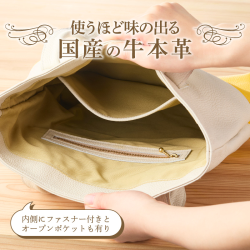 【説明】 ちょっとしたお出かけの際に便利なサイズ感。 お財布、スマートフォン、鍵やA4サイズのファイルも入ります。内側にファスナー付きとオープンポケットも有り大切なものを入れられます。流行りに流されない定番で使いやすいデザイン。使うほど味の出る高品質な牛本革バッグです。 【地場産品基準】 3号:原材料の仕入れ、革と布地の切断、接着、縫製、仕上げを区域内で行うことにより、約55%の付加価値が生じているもの。(素材のカットは区域外)