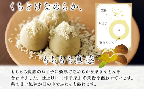 もっちりとした弾力が心地よい団子を、岐阜県産の高級和栗『利平栗』を贅沢に使った、なめらかな栗きんとんペーストで丁寧に包み込みました。