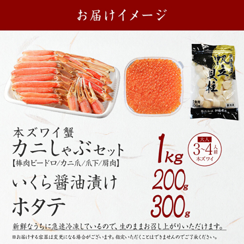 - 3597. ズワイ蟹しゃぶ 1kg いくら醤油漬け 200g ホタテ 300g 海鮮 3種 セット カニ かに 蟹 いくら イクラ 帆立 貝柱 ほたて 玉冷 生食可 海鮮 海鮮丼 鍋 しゃぶしゃぶ ズワイガニ ずわい蟹 ずわいがに ズワイ ずわい 豪華 贅沢 人気 つまみ おつまみ おかず ごはんのとも お取り寄せ グルメ 送料無料 北海道