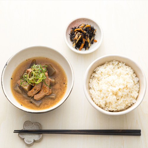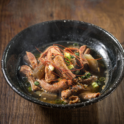 国内製造の豚小腸を丁寧にボイルし、味噌や醤油、みりん、そして風味豊かなかつおだしを隠し味に加えることで、奥深い味わいに仕上げています。こんにゃくも入っており、食べ応えも十分です。