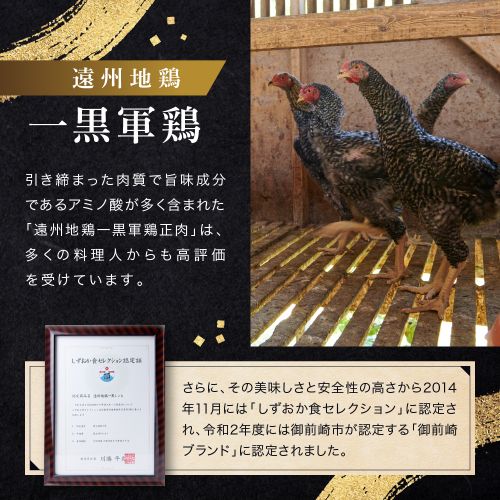 特別な食材として注目される「遠州地鶏一黒しゃも」 引き締まった肉質で旨味成分であるアミノ酸が多く含まれた「遠州地鶏一黒しゃも」。