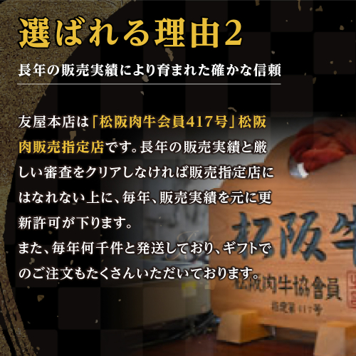 友屋本店オリジナルの化粧箱入り、松阪牛の証明書付き、金額のわかるものは同封しておりませんので、ギフトにも最適です。
