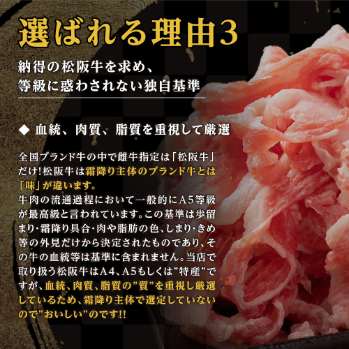 こちらの商品は特産松阪牛の4等級以上です。霜降り加減は画像と異なる場合がございますのでご了承ください。