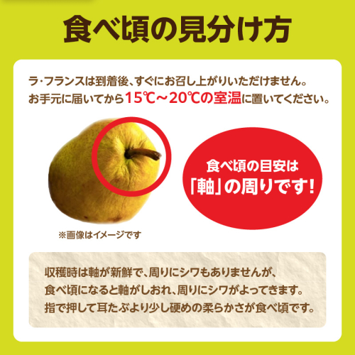 ※冷暗所で熟すまで待ってから食べるのがラ・フランスのおいしい食べ方です。へたの部分が赤ちゃんの耳たぶ程度になったら食べごろです。
