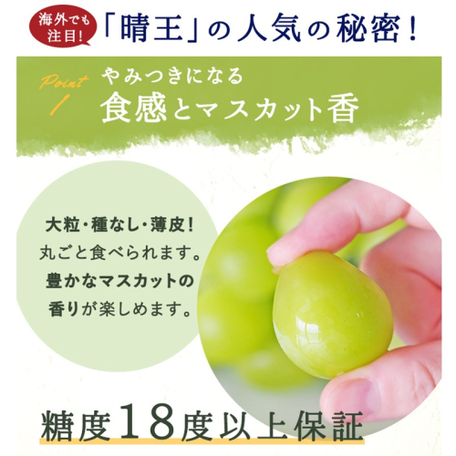 【配達不可:北海道・沖縄・離島】 晴王シャインマスカットは、日本が誇るプレミアムブドウ品種です。 糖度が高く、さわやかな甘みとほのかな酸味のバランスが絶妙であり、種無しで皮ごと食べられることから人気が高いです。