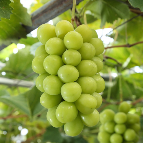 晴王シャインマスカットは、日本が誇るプレミアムブドウ品種です。 糖度が高く、さわやかな甘みとほのかな酸味のバランスが絶妙であり、種無しで皮ごと食べられることから人気が高いです。