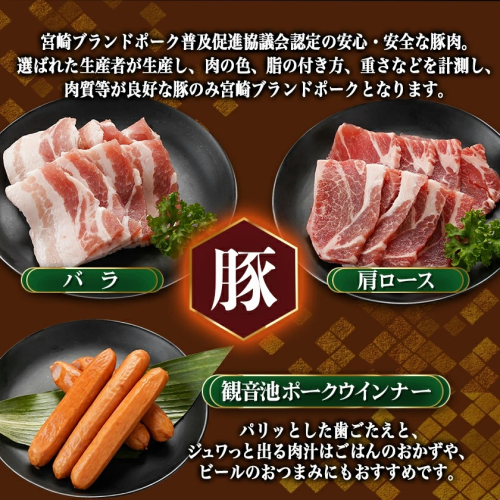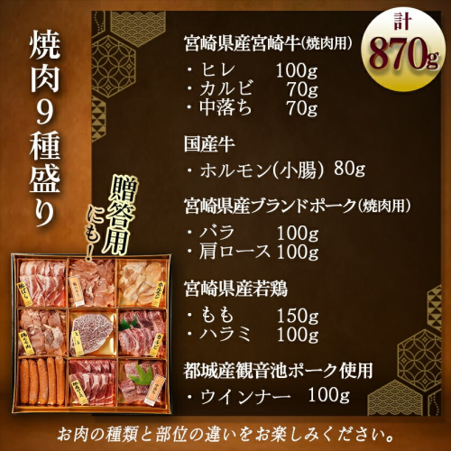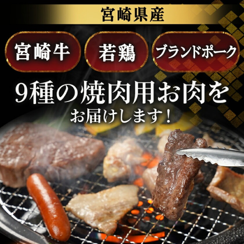 都城市で生産される「観音池ポーク」や、宮崎県が誇るブランド牛の「宮崎牛」、希少部位である「鶏はらみ」等、9種の焼肉用のお肉をセットにしてご用意しました。