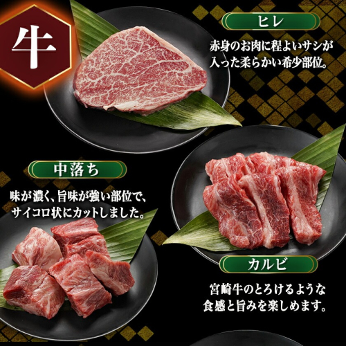 ヒレは、赤身のお肉に程よいサシが入った柔らかい希少部位。カルビは、宮崎牛のとろけるような食感と旨みを楽しめます。中落ちは、味が濃く、旨味が強い部位で、サイコロ状にカットしました。