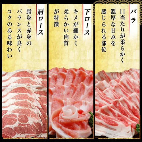 【黒豚】は、都城の広大な自然の中で肥育されており、灰汁が少ないのが特長。肩ロース・下ロース・バラの3種類をしゃぶしゃぶ用の薄切りスライスでご用意しました!