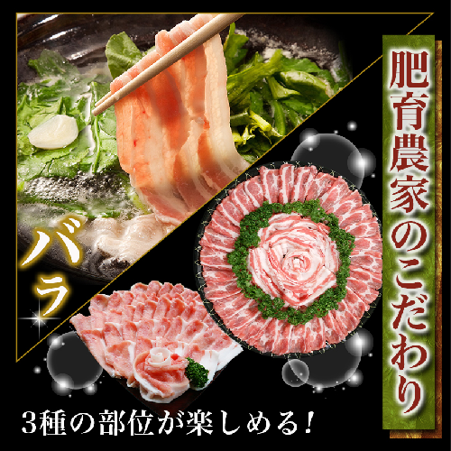 灰汁(アク)が少ないことが特長の【都城産黒豚】を、しゃぶしゃぶ用の薄切りスライスにした、3種の部位が楽しめるバラエティセットです!