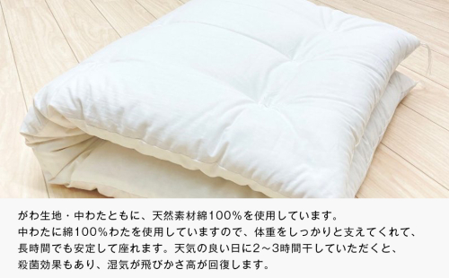 中わたに綿100%わたを使用していますので、体重をしっかりと支えてくれて、長時間でも安定して座れます。