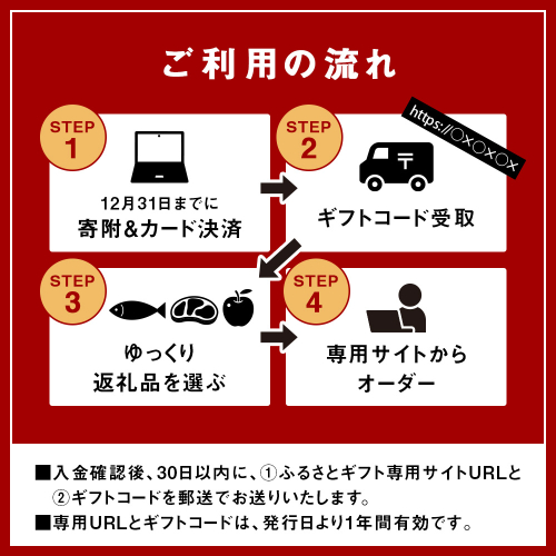 1.あとからセレクト【ふるさとギフト】をお申込み後、ギフトコードとギフトサイトのURLが記載された書面が届きます。